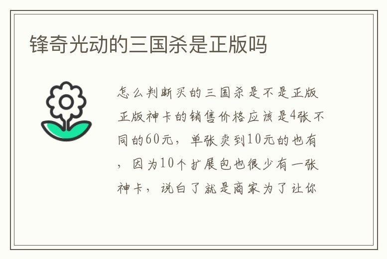 是正版的,包括風林火山界限突破等包。《三國殺》是中國傳媒大學動畫學院2004級游戲專業學生設計,由北京游卡桌游文化發展有限公司出版發行的一款熱門的桌上游戲。并在2009年6月底由杭州邊鋒網絡技術有限公司開發出網絡游戲。該。