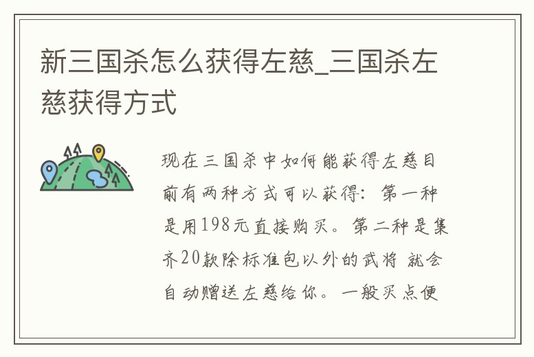 在《三國殺》里面玩家要想獲得左慈可以通過兩種方式,一種是玩家在游戲當中連續購買23個收費武將,當達到這個條件之后,系統會自動贈送左慈。還有一種方法就是在游戲中的商城里面直接購買。兩種方法都差不多,玩家想要獲得左慈可。