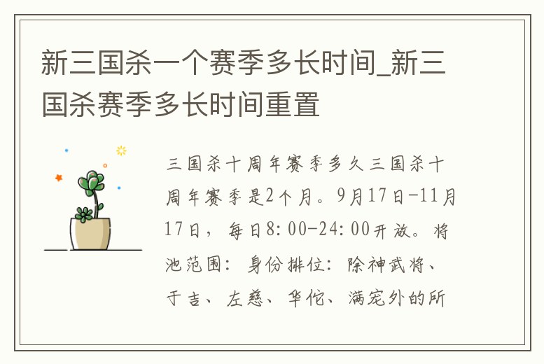 新三國殺一個賽季多長時間_新三國殺賽季多長時間重置