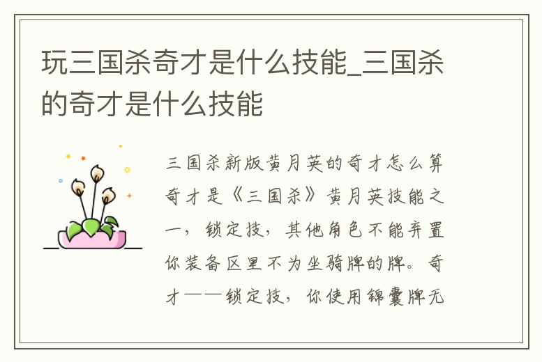 三國殺里面奇才是黃月英的一個武將技能,在正式里面是黃月英的父親黃承彥說她有才。三國殺是中國傳媒大學動畫學院2004級游戲專業學生設計,由北京游卡桌游文化發展有限公司出版發行的一款熱門的桌上游戲,并在2009年6月底由杭州邊。