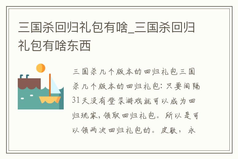 三國殺幾個版本的回歸禮包:只要間隔31天沒有登錄游戲就可以成為回歸玩家,領取回歸禮包。所以是可以領兩次回歸禮包的。皮膚,永久都沒有好寒酸啊。大佬們知道獎勵有幾天么。獎勵各是什么啊。總是有小伙伴問,回歸獎勵怎么樣。