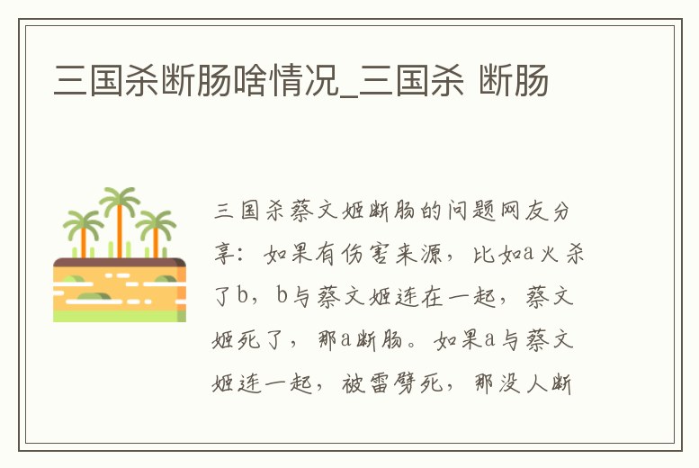 網友分享:因為傷害來源是自己,所以斷腸對自己發動。如果被救起,則無法觸動斷腸。因為傷害來源是閃電,無法對任何人發動斷腸。因為孟獲(孟獲的“禍首”)為傷害來源,如果蔡文姬死了且沒被救起,則對孟獲發動斷腸。因為。