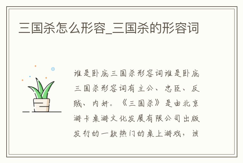 誰是臥底三國殺形容詞有主公、忠臣、反賊、內(nèi)奸。《三國殺》是由北京游卡桌游文化發(fā)展有限公司出版發(fā)行的一款熱門的桌上游戲,該游戲融合了西方類似游戲的特點(diǎn),并結(jié)合中國三國時(shí)期背景,以身份為線索,以卡牌為形式,集合歷史。