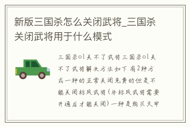 三國殺ol關不了武將解決方法如下 有2種方式一種的正常關閉免費的但是不能關閉標風武將(非標風武將需要開通后才能關閉)一種是購買天牢令可關閉標風武將關閉之后在游戲時這些武將不會進入你的選。 點擊左下角武將就可以切換。