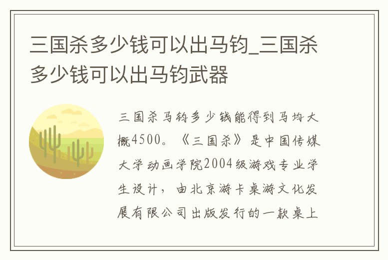 馬均大概4500。《三國殺》是中國傳媒大學動畫學院2004級游戲專業學生設計,由北京游卡桌游文化發展有限公司出版發行的一款桌上游戲,并在2009年6月底由杭州邊鋒網絡技術有限公司開發出網絡游戲。該游戲融合了西方類似游戲的特點。