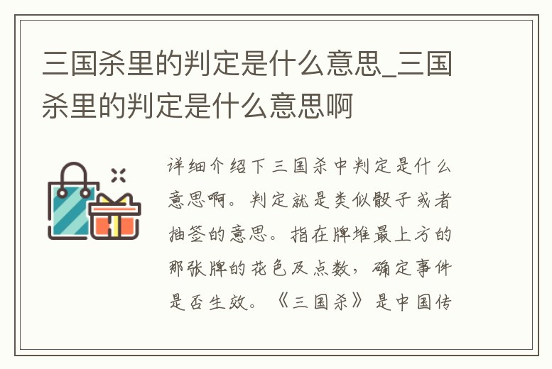 判定就是類似骰子或者抽簽的意思。指在牌堆最上方的那張牌的花色及點數,確定事件是否生效。《三國殺》是中國傳媒大學動畫學院2004級游戲專業學生設計,由北京游卡桌游文化發展有限公司出版發行的一款熱門的桌上游戲。該游戲融合。