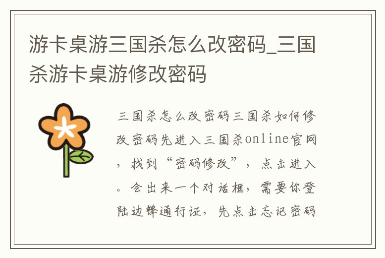 1.先進入三國殺online官網,找到“密碼修改”,點擊進入。2.會出來一個對話框,需要你登陸邊鋒通行證,先點擊忘記密碼。3.然后輸入自己需要修改密碼的三國殺游戲賬號,再輸入方框中的驗證碼。4.然后通過手機找回,這種必須是綁定。