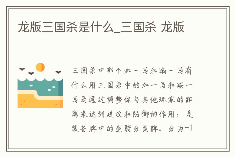三國殺中的加一馬和減一馬是通過調整你與其他玩家的距離來達到進攻和防御的作用,是裝備牌中的坐騎分類牌。分為-1坐騎(進攻馬)和+1坐騎(防御馬)。加一馬:-1坐騎(進攻馬)鎖定技,你與其他角色的距離-1。(可。