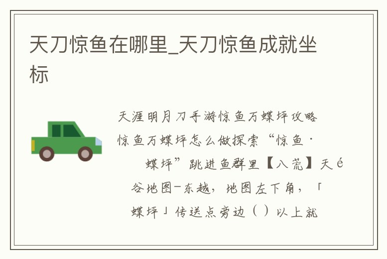 探索“驚魚·萬蝶坪”跳進魚群里 【八荒】天香谷 地圖-東越,地圖左下角,「萬蝶坪」傳送點旁邊()以上就是我所有的分享了,希望能幫助到大家。div_dh { margin-bottom:10px; height:auto; overfl。