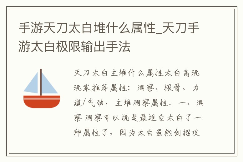 太白高玩玩家推薦屬性:洞察、根骨、力道/氣勁,主堆洞察屬性。一、洞察 洞察可以說是最適合太白了一種屬性了,因為太白雖然劍招攻擊次數很多,攻速也很快,但是傷害面板卻不是很高,所以需要瘋狂疊洞察所加成的會心屬性,太。