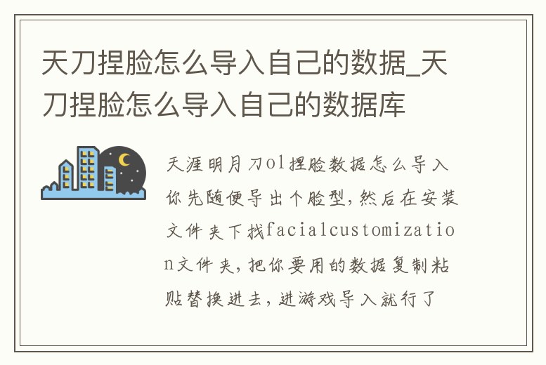 網上下載好需要的捏臉數據,解壓,把解壓后的文件 facialcustomparamdata_export.dat 放入天涯明月刀安裝文件夾里的facialcustomization(建議先在角色面板里點一次導出按鈕,因為默認沒有創建此文件夾)文件夾里面,提示有此文件就。