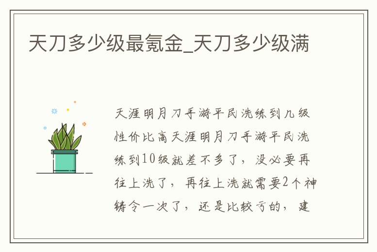 天涯明月刀手游平民洗練到幾級性價比高天涯明月刀手游平民洗練到10級就差不多了,沒必要再往上洗了,再往上洗就需要2個神鑄令一次了,還是比較虧的,建議先留著吧全身洗到10級符合自己職業的詞條,在開始準備沖擊15級,然后20級,這樣子是比較劃得來,也是性價。1、天刀手游80級0氪多少功力85000-90000。《天涯明月刀手游》是古龍正版授權,騰訊游戲制作發行的一款國風大世界MMO