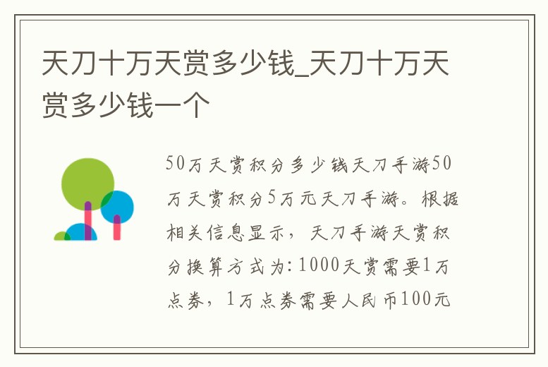 50萬天賞積分多少錢天刀手游50萬天賞積分5萬元天刀手游。根據相關信息顯示,天刀手游天賞積分換算方式為:1000天賞需要1萬點券,1萬點券需要人民幣100元,因此1000天賞需要人民幣100元,50萬天賞則需要人民幣5萬元。1、天刀
