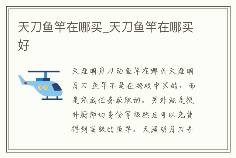 天涯明月刀 魚竿不是在游戲中買的,而是完成任務獲取的。另外就是提升廚師的身份等級然后可以免費得到高級的魚竿。天涯明月刀手游魚竿在哪里買在游戲中釣魚不是買的,而是完成任務來獲取,另外就是升級廚師的身份等級然后可以免。