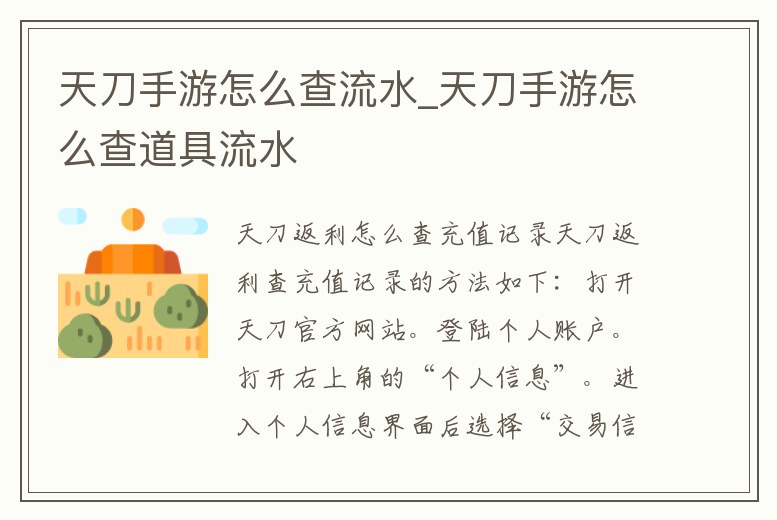 天刀返利怎么查充值記錄天刀返利查充值記錄的方法如下:打開天刀官方網站。登陸個人賬戶。打開右上角的“個人信息”。進入個人信息界面后選擇“交易信息”。在查詢頁面選擇查詢時間段。時間段選擇完畢后,點擊查詢即可。交易。1、怎么查天涯明月刀歷史充值多少首先