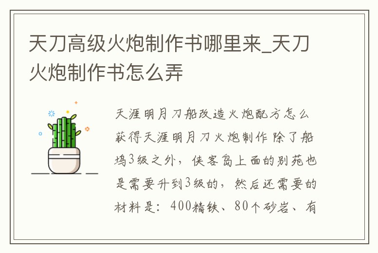 天涯明月刀火炮制作 除了船塢3級之外,俠客島上面的別苑也是需要升到3級的,然后還需要的材料是:400精鐵、80個砂巖、有4個火炮圖紙、3W宋幣。想要獲得配方圖紙,玩家需要去完成航海任務,一般情況下,靈鹿島任務做完會得到圖。