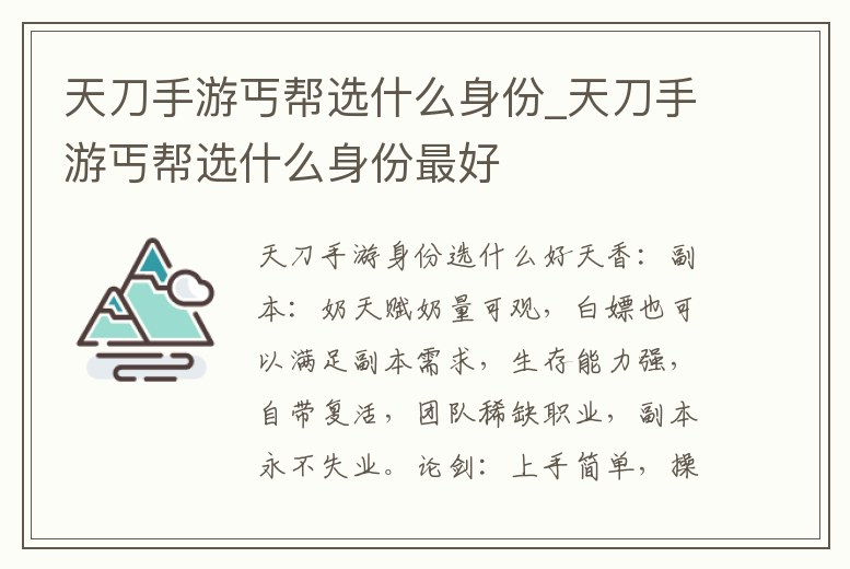 天刀手游身份選什么好天香:副本:奶天賦奶量可觀,白嫖也可以滿足副本需求,生存能力強,自帶復活,團隊稀缺職業,副本永不失業。論劍:上手簡單,操作簡單,先手能力強,傷害高,虐菜專用職業。丐幫:副本天賦可以做主t,配合噴酒,百裂。2、天涯明月刀ol,丐幫的身份應該選什么身份和門派沒有很