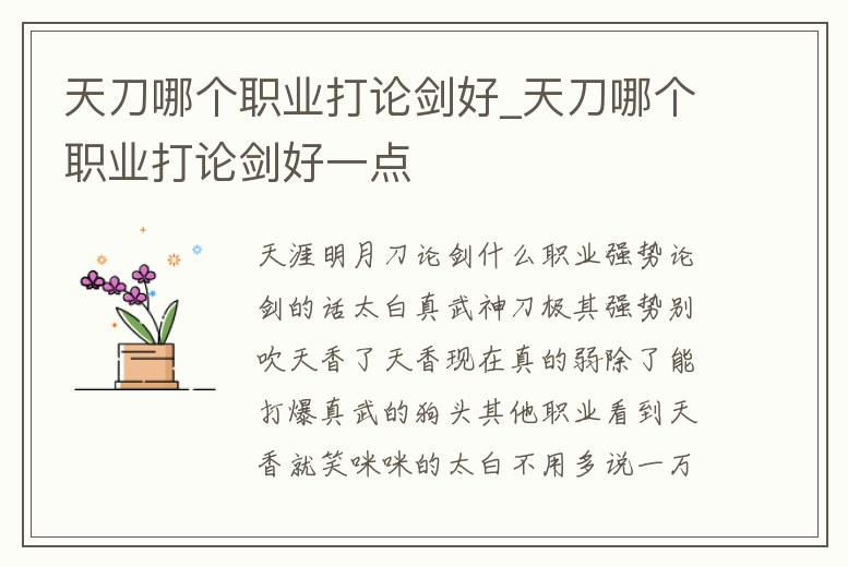 天涯明月刀論劍什么職業(yè)強勢論劍的話太白真武神刀極其強勢別吹天香了天香現(xiàn)在真的弱除了能打爆真武的狗頭其他職業(yè)看到天香就笑咪咪的太白不用多說一萬功力到一萬八功力的太白論劍就是一個字秒逼出對面解控就是兩套刷新秒人真武唯一一個堆防御屬性還是。1、天涯明月刀手游哪個職業(yè)神威:輸出很穩(wěn)定,不需要什么操作的主,強在爆發(fā)而非持續(xù)輸出。論劍:近戰(zhàn)之中手最長的