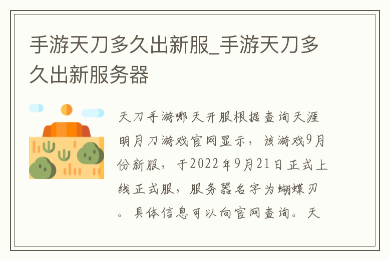 根據(jù)查詢天涯明月刀游戲官網(wǎng)顯示,該游戲9月份新服,于2022年9月21日正式上線正式服,服務(wù)器名字為蝴蝶刃。具體信息可以向官網(wǎng)查詢。天涯明月刀手游11月新區(qū)開放時(shí)間:天涯明月刀手游11月18日23.20分開微信24大區(qū)-心念紅塵。