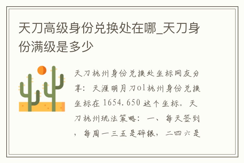 網友分享:天涯明月刀ol杭州身份兌換坐標在 1654.650 這個坐標。天刀杭州玩法策略:一、每天簽到,每周一三五是碎銀,二四六是心法殘頁,周日是活躍度排名的禮盒獎勵。二、盟會俸祿、幫派俸祿:可按O鍵打開幫派界面左下角領取。三、