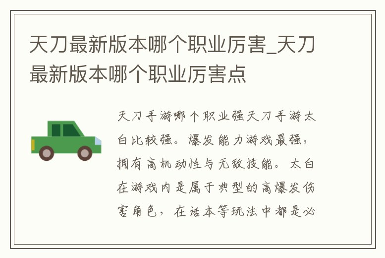 天刀手游太白比較強。爆發能力游戲最強,擁有高機動性與無敵技能。太白在游戲內是屬于典型的高爆發傷害角色,在話本等玩法中都是必帶的,尤其是后期的boss在低血量時會進入狂暴階段。此時如果有裝備較為不錯的太白,就可以配。