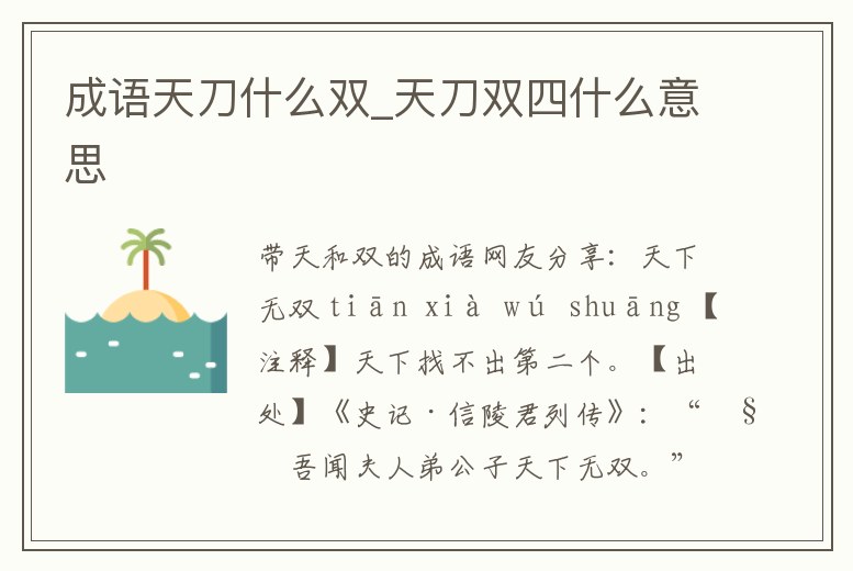 網友分享:天下無雙 tiān xià wú shuāng 【注釋】天下找不出第二個。【出處】《史記·信陵君列傳》:“始吾聞夫人弟公子天下無雙。”【舉例】這幅古畫,據說是~的稀世珍品。【近義詞】獨一無二、天下第一、出類拔萃 【。