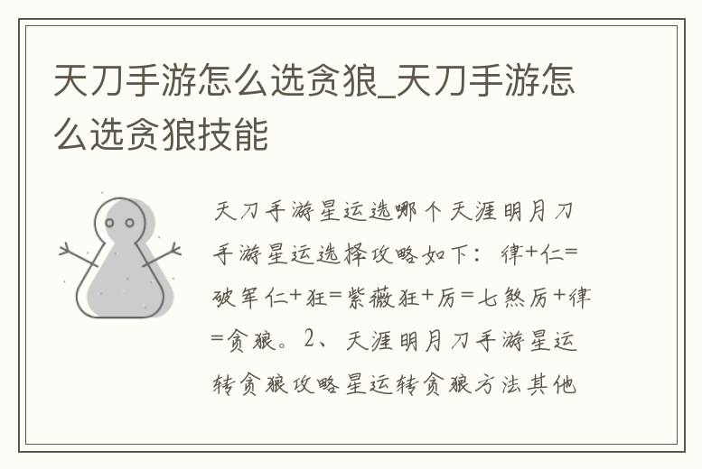 天刀手游怎么選貪狼_天刀手游怎么選貪狼技能