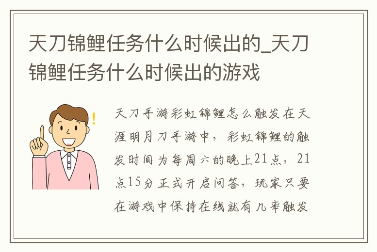 在天涯明月刀手游中,彩虹錦鯉的觸發時間為每周六的晚上21點,21點15分正式開啟問答,玩家只要在游戲中保持在線就有幾率觸發彩虹錦鯉。在問答中,只要玩家回答錯誤了,或者對應時間沒有進入圈子中就會淘汰。