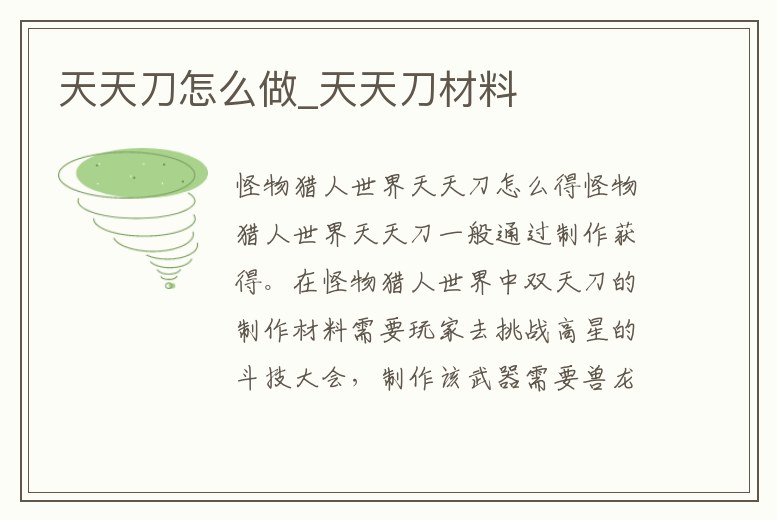怪物獵人世界天天刀一般通過制作獲得。在怪物獵人世界中雙天刀的制作材料需要玩家去挑戰高星的斗技大會,制作該武器需要獸龍硬幣,擊龍王硬幣,龍玉,飛龍硬幣。在冰原中雙天刀還可以升級為三天刀,升級材料依然需要玩家去。
