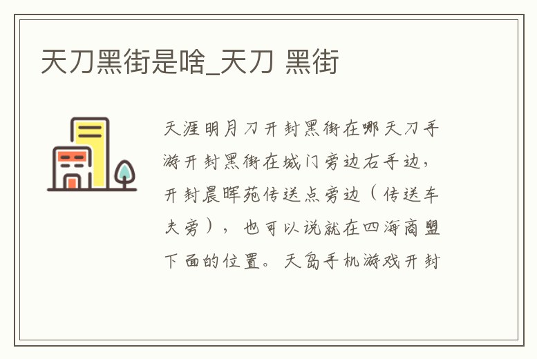 天刀開封抄黑街就位于開封晨輝苑傳送點旁邊,也可以說就在四海商盟下面的位置;想要觸發這個任務,需要完成辨物居方,而且龍首山的聲望需要達到席中客。天刀開封黑街中玩家可以使用令牌提升,武道風流和等級也是有限制的;房子。