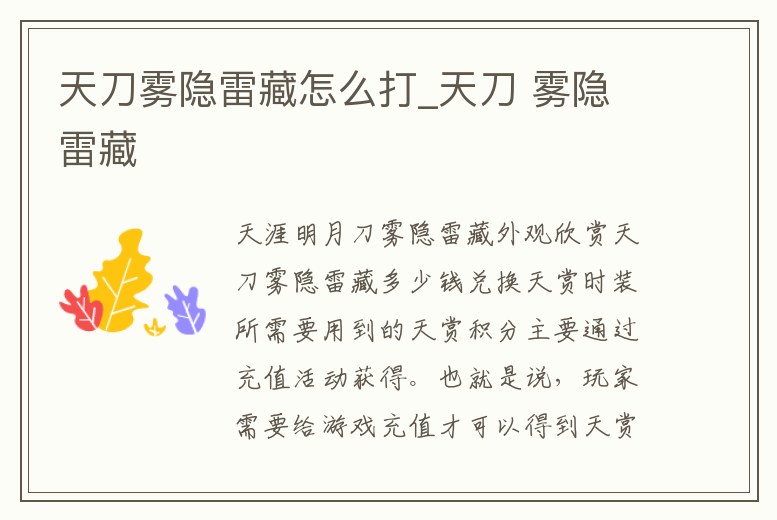 兌換天賞時裝所需要用到的天賞積分主要通過充值活動獲得。也就是說,玩家需要給游戲充值才可以得到天賞積分,而充的越多給的天賞積分也就越多。在天刀中,一元錢可以購買100點券,在充值點券時玩家可以同步獲得天賞積分。