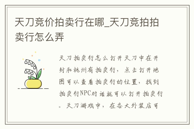 杭州城拍賣行兩側(cè)。天刀發(fā)布公告顯示,天刀杭州擺攤區(qū)在杭州城拍賣行兩側(cè)。《天涯明月刀》是騰訊北極光工作室研發(fā)的一款武俠題材的3D大型多人在線角色扮演電腦客戶端國產(chǎn)游戲。