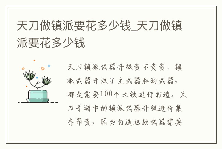 貴。鎮派武器開放了主武器和副武器,都是需要100個大鐵進行打造。天刀手游中的鎮派武器升級造價集齊昂貴,因為打造這款武器需要用到金裝和100個隕焰之石,也就是大鐵,鎮派武器相當于更高一個檔次的金裝,屬性加成是要比。
