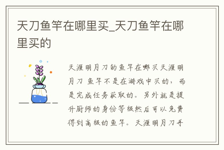 天涯明月刀 魚竿不是在游戲中買的,而是完成任務獲取的。另外就是提升廚師的身份等級然后可以免費得到高級的魚竿。天涯明月刀手游魚竿在哪里買在游戲中釣魚不是買的,而是完成任務來獲取,另外就是升級廚師的身份等級然后可以免。