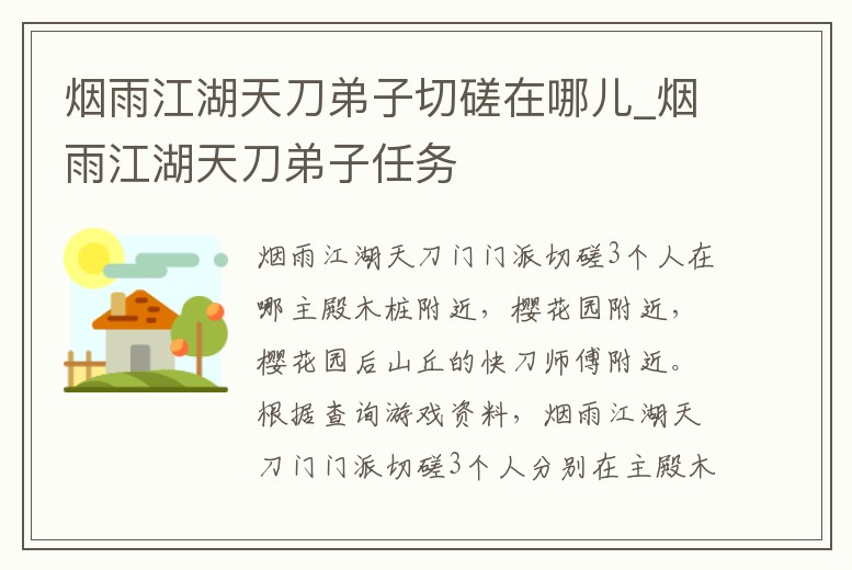 主殿木樁附近,櫻花園附近,櫻花園后山丘的快刀師傅附近。根據查詢游戲資料,煙雨江湖天刀門門派切磋3個人分別在主殿木樁附近,櫻花園附近,櫻花園后山丘的快刀師傅附近。煙雨江湖是一款由杭州藍鯨網絡科技有限公司研發與杭州西米。