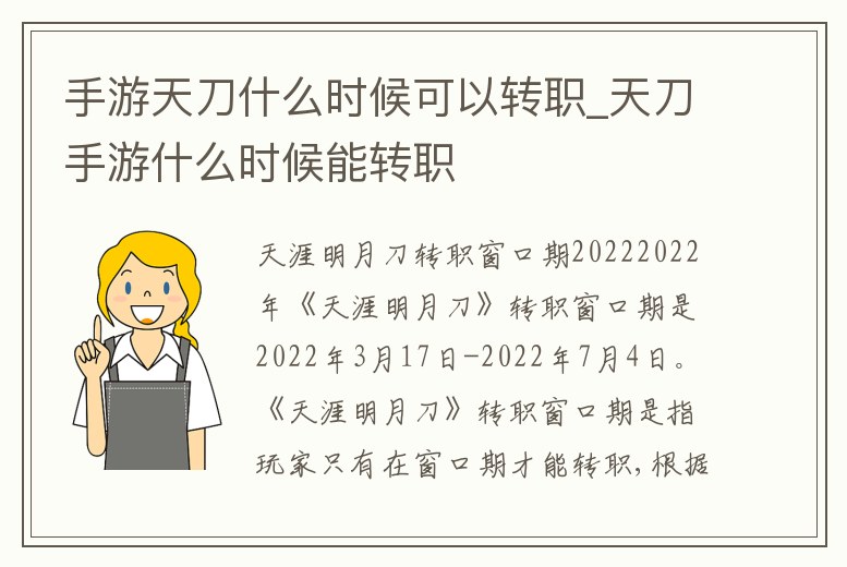 2022年《天涯明月刀》轉職窗口期是2022年3月17日-2022年7月4日。《天涯明月刀》轉職窗口期是指玩家只有在窗口期才能轉職,根據2022年《天涯明月刀》游戲官網發布的通告可知,2022年轉職窗口期是2022年3月17日-2022年7月4。