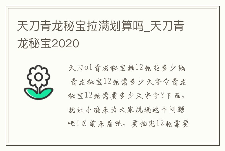 天刀青龍秘寶拉滿劃算嗎_天刀青龍秘寶2020