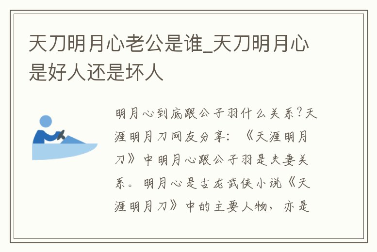 網(wǎng)友分享:《天涯明月刀》中明月心跟公子羽是夫妻關(guān)系。明月心是古龍武俠小說《天涯明月刀》中的主要人物,亦是該書出場最多的女性角色,乃公子羽之妻,即卓夫人。自稱原名「唐藍」,是蜀中唐門長房的長女。曾為了接近傅紅雪,易容成。
