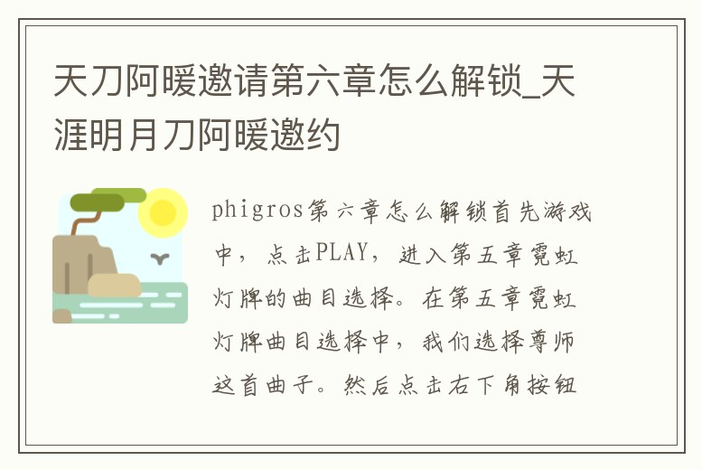 首先玩家需要把痙攣曲目打到評價A級以上,之后返回曲目界面往下滑就會發(fā)現(xiàn)Leave All Behind這首新曲目,然后再將這首曲目打到評價A級以上就可解鎖第六章了。phigros是一款非常出色的音樂類型手游,并且很考驗玩家的音樂節(jié)奏感以及。
