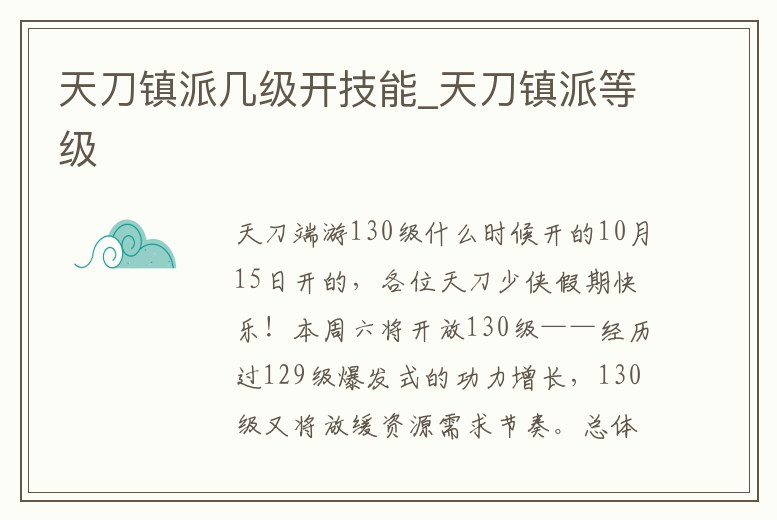 10月15日開的,各位天刀少俠假期快樂!本周六將開放130級——經歷過129級爆發式的功力增長,130級又將放緩資源需求節奏。總體來說,資源需求量較少,值得一提的是130級還開放了鎮派的9級。本期,讓我們來詳細了解一下這。