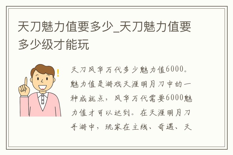 6000。魅力值是游戲天涯明月刀中的一種成就點,風華萬代需要6000魅力值才可以達到。在天涯明月刀手游中,玩家在主線、奇遇、天命任務體驗中做出選擇將獲得星運值,完成星運答題玩法根據選擇可獲得不同星運值。