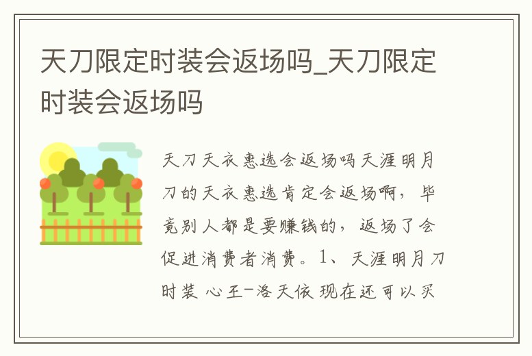天刀限定時裝會返場嗎_天刀限定時裝會返場嗎