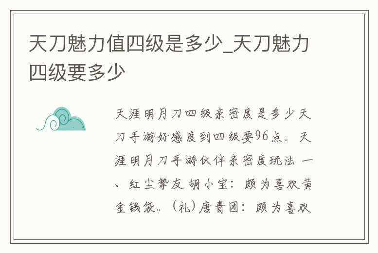 天刀手游好感度到四級要96點。天涯明月刀手游伙伴親密度玩法 一、紅塵摯友 胡小寶:頗為喜歡黃金錢袋。(禮)唐青團:頗為喜歡山河社稷圖。(禮)阿暖: 最愛羊方藏魚。(食)趙莞兒:最愛酒心雪蓮酥。(食)。