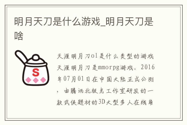 天涯明月刀是mmorpg游戲。2016年07月01日在中國大陸正式公測,由騰訊北極光工作室研發的一款武俠題材的3D大型多人在線角色扮演電腦客戶端游戲。天涯明月刀有豐富的社交系統,在游戲中玩家可以拜師和收徒,可以參加幫會,和幫會成員。