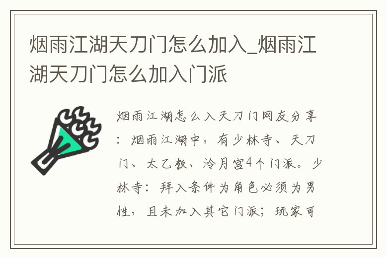 網友分享:煙雨江湖中,有少林寺、天刀門、太乙教、泠月宮4個門派。少林寺:拜入條件為角色必須為男性,且未加入其它門派;玩家可以拜新手導師靜觀為師,成為靜字輩弟子。天刀門:拜入條件為未加入其它門派;玩家可以拜新手導師謝毅為師。