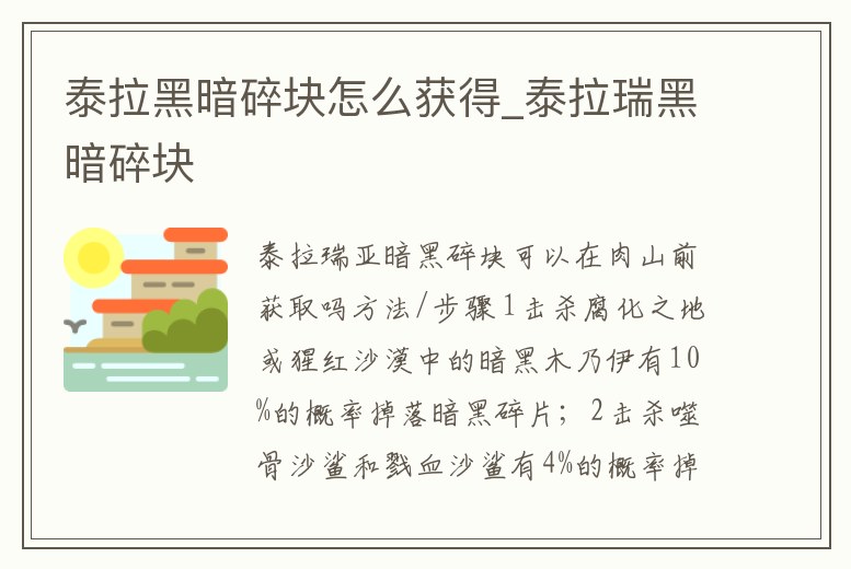 方法/步驟 1擊殺腐化之地或猩紅沙漠中的暗黑木乃伊有10%的概率掉落暗黑碎片;2擊殺噬骨沙鯊和戮血沙鯊有4%的概率掉落暗黑碎片;3擊殺猩紅之地中的紅染食尸鬼有6.67%的概率掉落暗黑碎片;4擊殺腐化地下沙漠中的腐惡食。