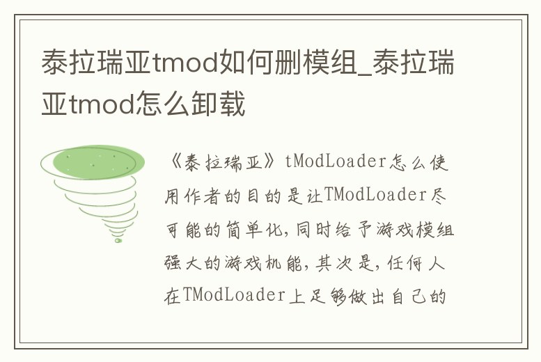 《泰拉瑞亞》tModLoader怎么使用作者的目的是讓TModLoader盡可能的簡單化,同時給予游戲模組強大的游戲機能,其次是,任何人在TModLoader上足夠做出自己的獨立MOD。游戲簡介:《泰拉瑞亞》tModLoader使用圖文教程工具簡介使用教程報錯解決方法實例制作流程常見問題解答。1、泰拉瑞亞玩mod必須用