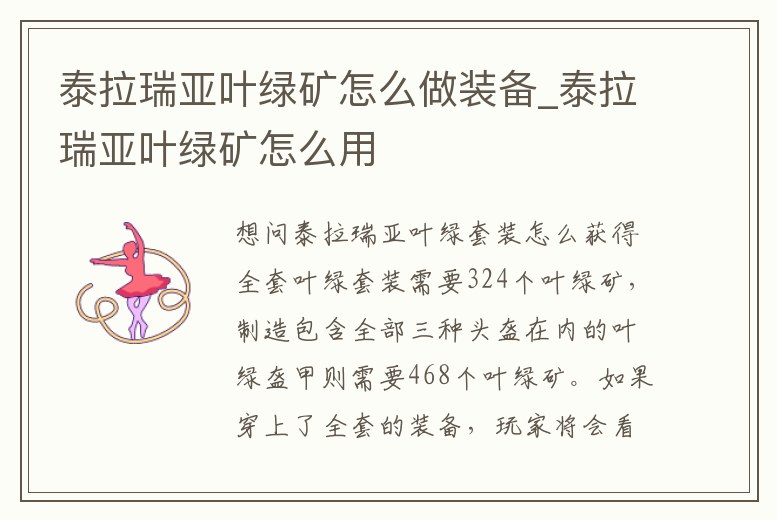 想問泰拉瑞亞葉綠套裝怎么獲得全套葉綠套裝需要324個葉綠礦,制造包含全部三種頭盔在內的葉綠盔甲則需要468個葉綠礦。如果穿上了全套的裝備,玩家將會看到一個水晶葉一直飄在你的頭上,通過遠程射擊自動攻擊敵人,而且不耗費魔力或者彈