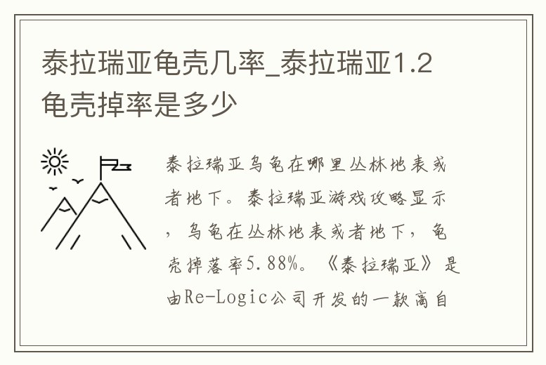 叢林地表或者地下。泰拉瑞亞游戲攻略顯示,烏龜在叢林地表或者地下,龜殼掉落率5.88%。《泰拉瑞亞》是由Re-Logic公司開發的一款高自由度的沙盒游戲,于2011年5月16日在PC上發行。