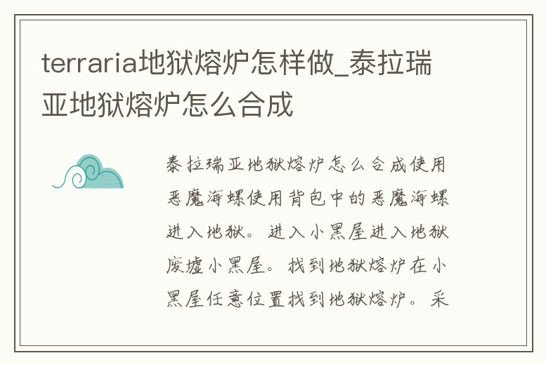 在巖漿上放水,就能做成黑曜石。找到地獄熔爐:在地獄堡壘找到后用任意鎬子挖掉帶回家。最后把地獄熔爐放下,將獄巖石和黑曜石準備好后即可去地獄熔爐合成獄巖錠。《泰拉瑞亞》游戲簡介 《泰拉瑞亞》是由Re-Logic公司開發(fā)。
